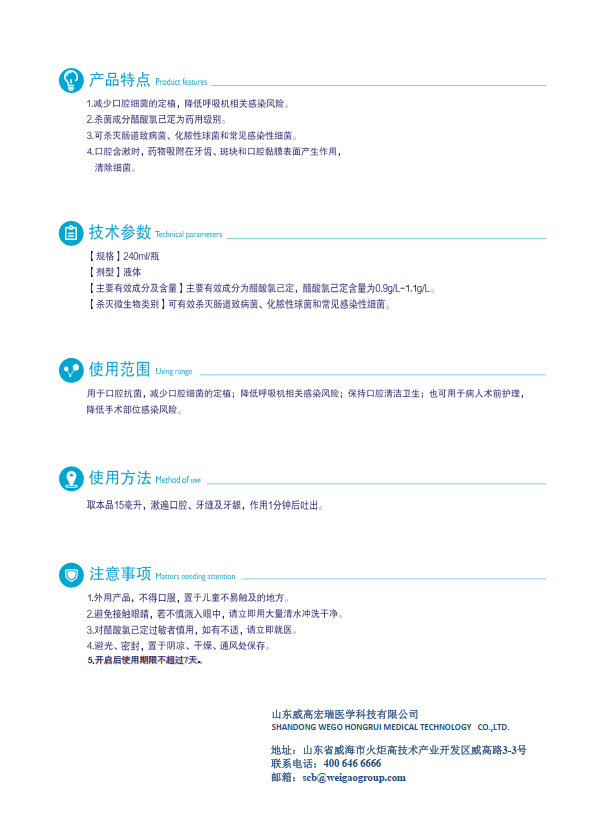 1.減少口腔細(xì)菌的定植,降低呼吸機(jī)相關(guān)感染風(fēng)險(xiǎn)。2.殺菌成分醋酸氯己定為藥用級(jí)別。3.可殺滅腸道致病菌、化膿性球菌和常見(jiàn)感染性細(xì)菌。4.口腔含漱時(shí),藥物吸附在牙齒、斑塊和口腔黏膜表面產(chǎn)生作用,清除細(xì)菌。