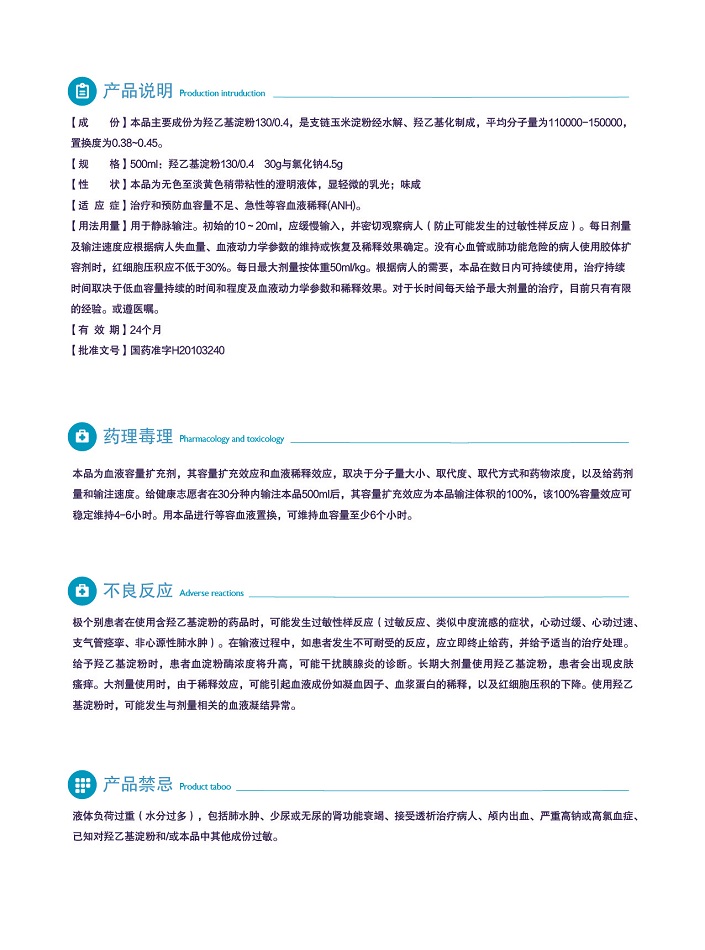 【規(guī) 格】500ml:羥乙基淀粉130/0.4 30g與氯化鈉4.5g